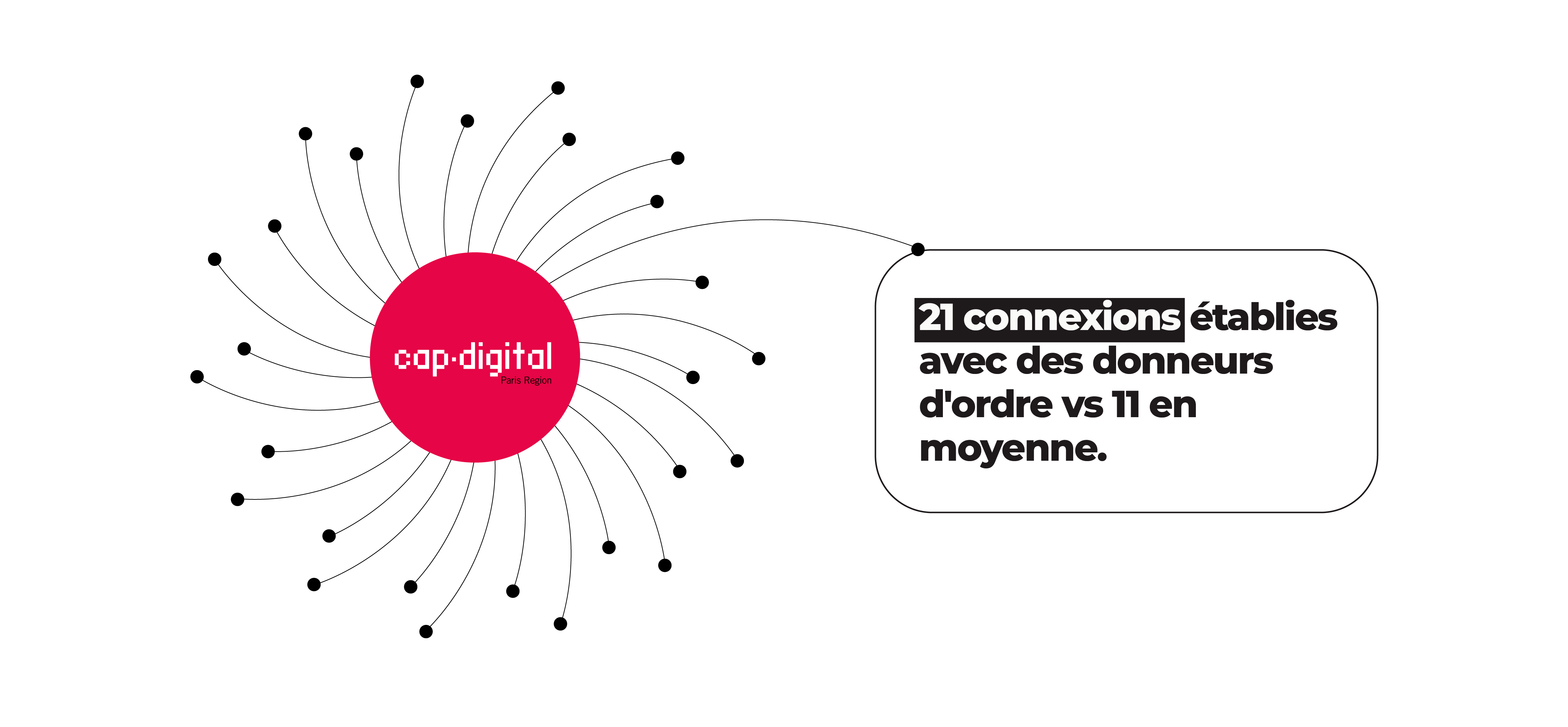 L’étude met en lumière un avantage compétitif significatif : la force des connexions d’affaires. Un adhérent Cap Digital dispose en moyenne de 21 liens dits « catalyseurs » avec des grands comptes. C’est pratiquement le double de la moyenne nationale, établie à 11 liens.